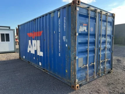 Contentor marítimo 20 pés usado em Classe B (WWT), cor azul, marca APL. 📦 Fotos reais do produto.